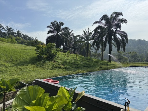 Unlike a typical chlorinated hotel pool, this felt more like a rustic, farm-style soak — simple, natural, and soothing. The kids splashed around happily, their laughter echoing through the trees, while we sat back and took in the view. Dragonflies flitted around us, catching the morning light like tiny jewels — a small detail, but one that made the moment feel especially peaceful.