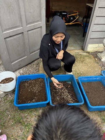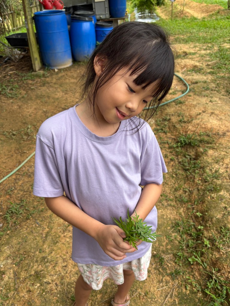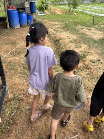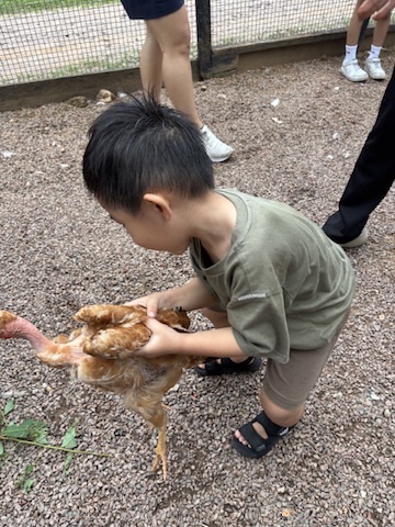 Then came the chicken coop, and things got even more exciting. After a quick lesson on black soldier fly larvae (a sustainable chicken snack!), J bravely scooped up the wriggly bugs with her bare hands to feed the chickens. Proud parenting moment? Absolutely. YB even caught two chickens by hand — something we’ll be hearing about for years, no doubt.