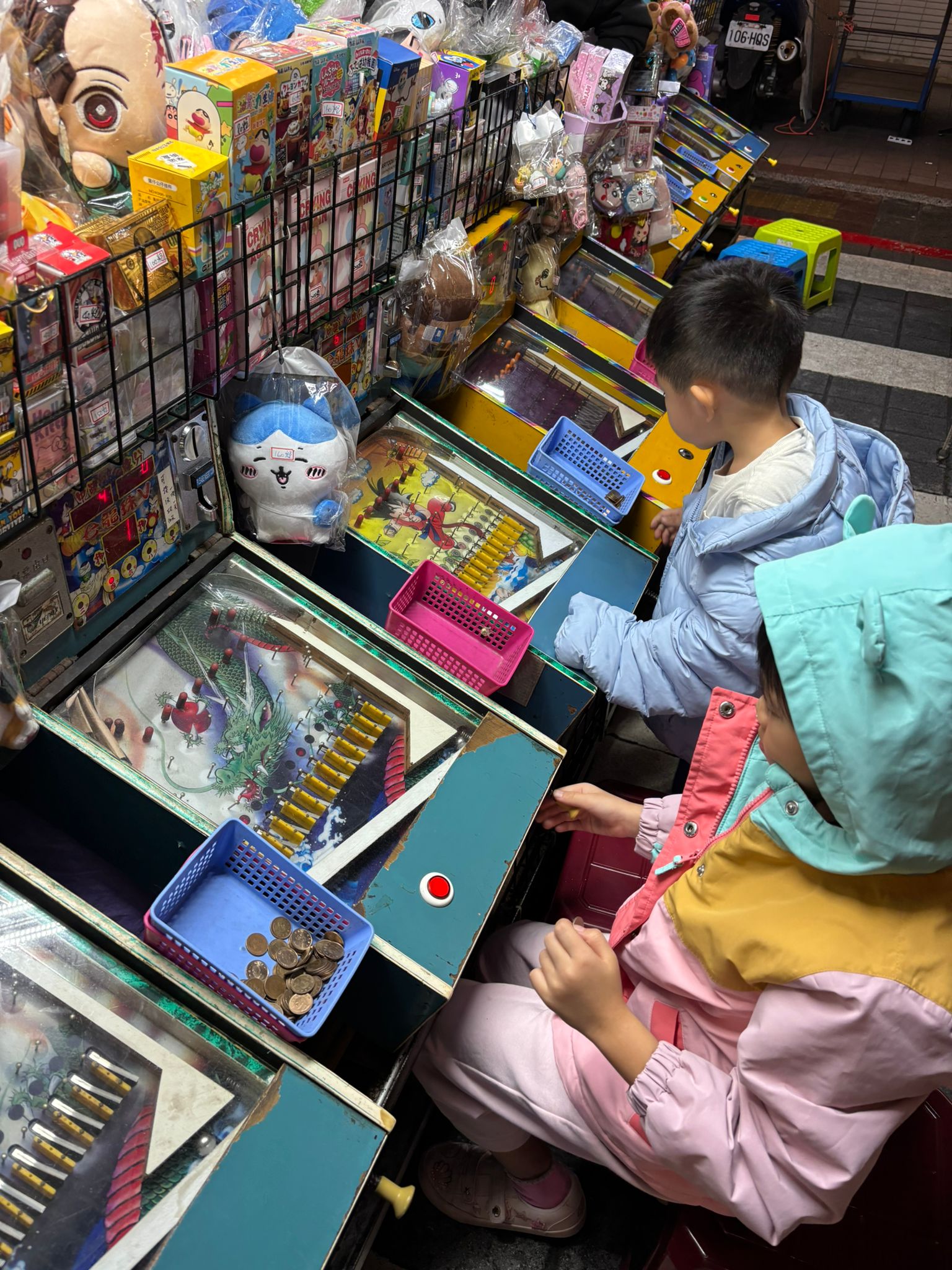 What surprised us was how the prizes worked. You could tell the stall owner which prize you wanted (say, a Pokémon plush toy), and he would tell you how many trays of balls it was worth. So you’re not really aiming for the kids to “win big” in the usual sense — you’re more or less guaranteed the prize, as long as you’re happy with how many trays of balls it costs. Once we understood that, it felt more like a fun, low-stress experience than a competitive game, which was perfect for the kids because they each get to go home with what they want.