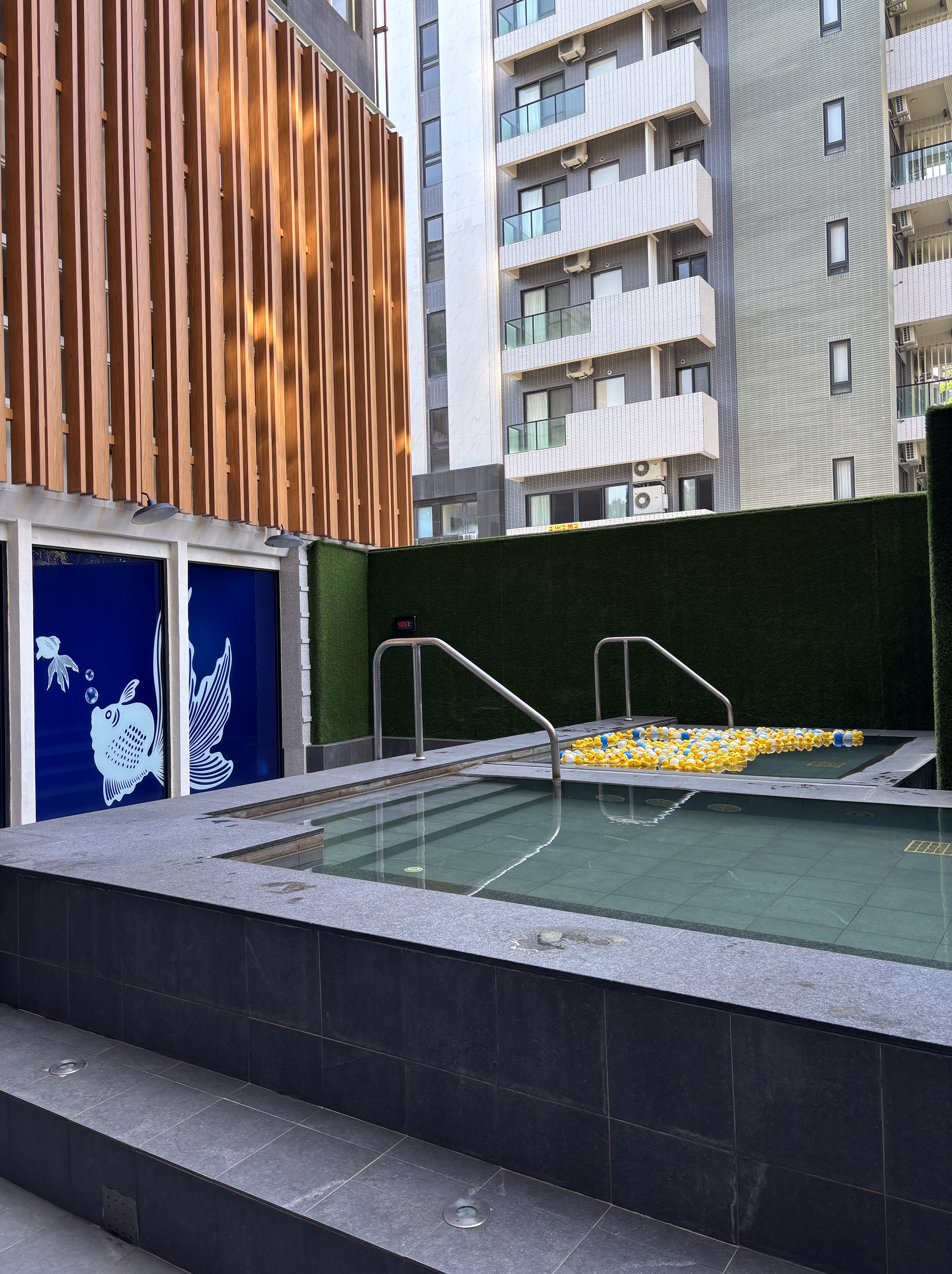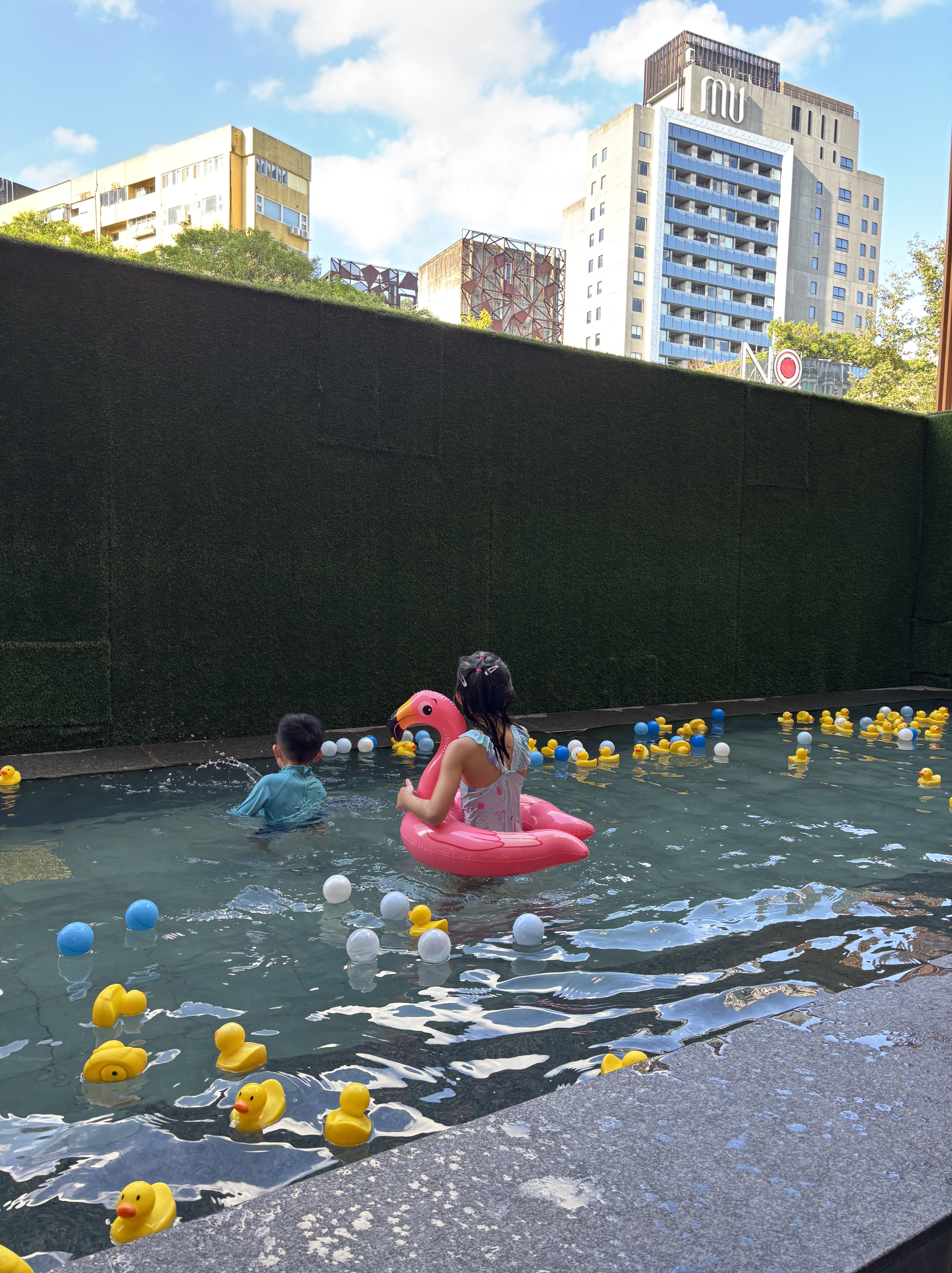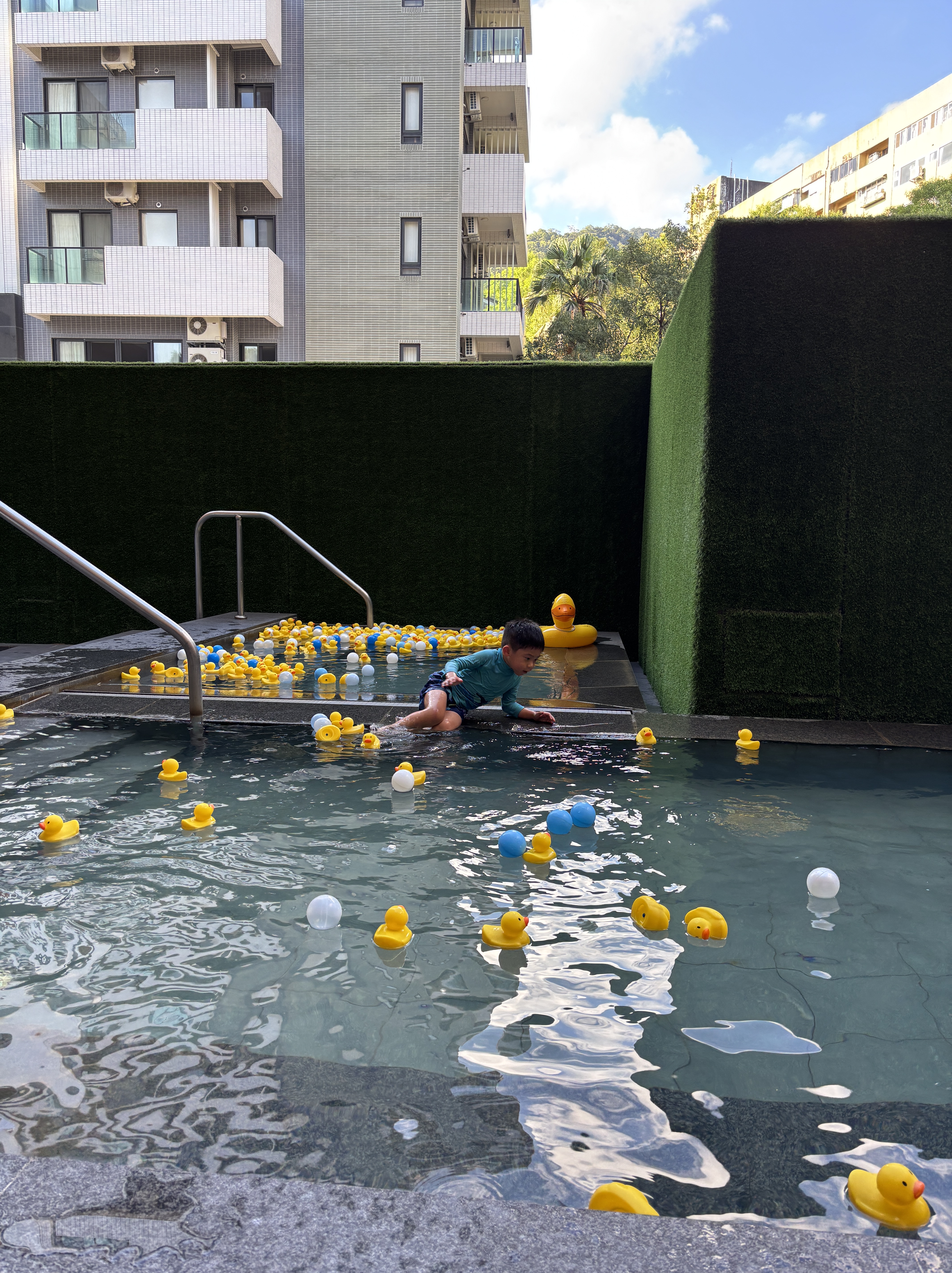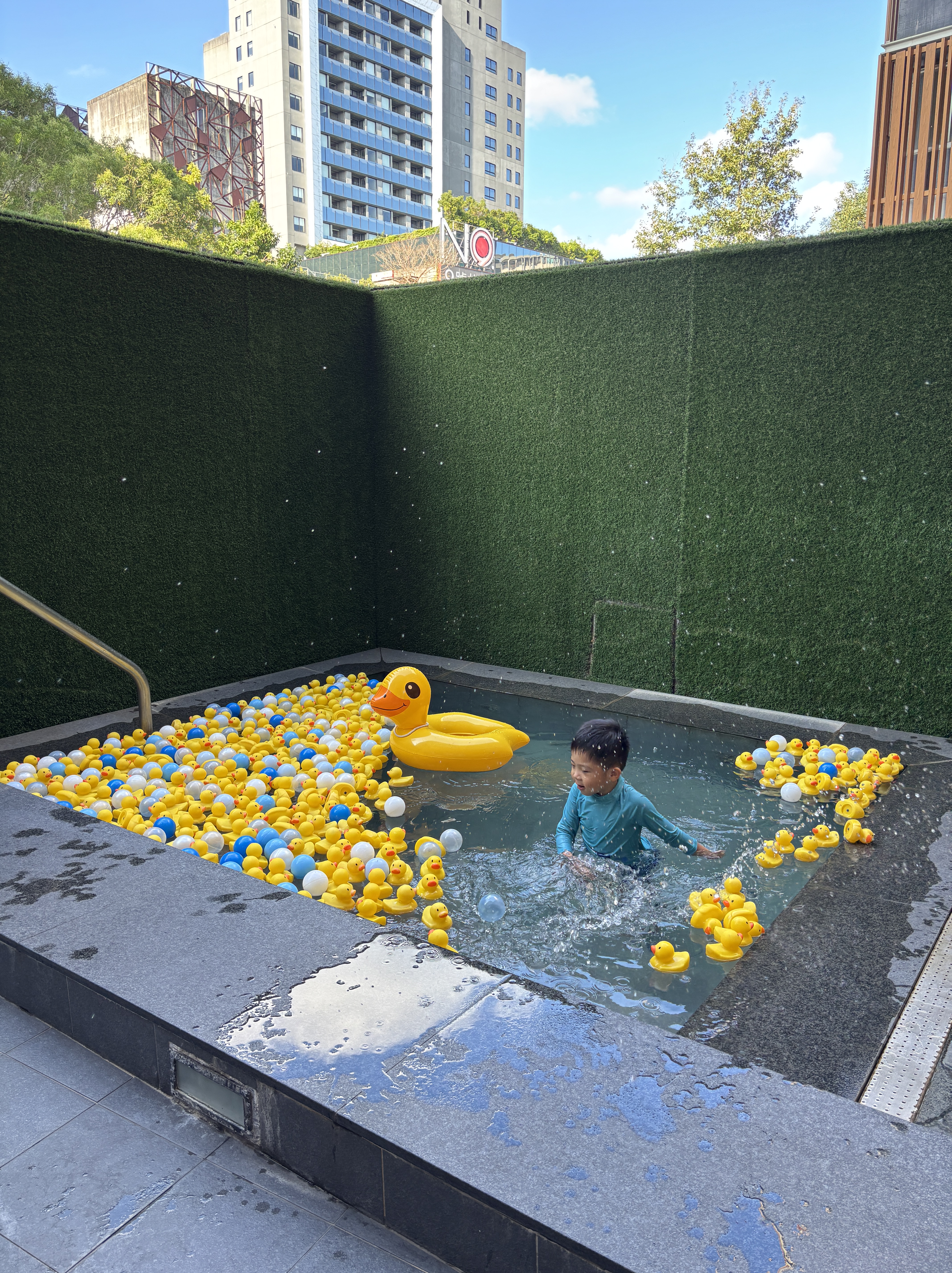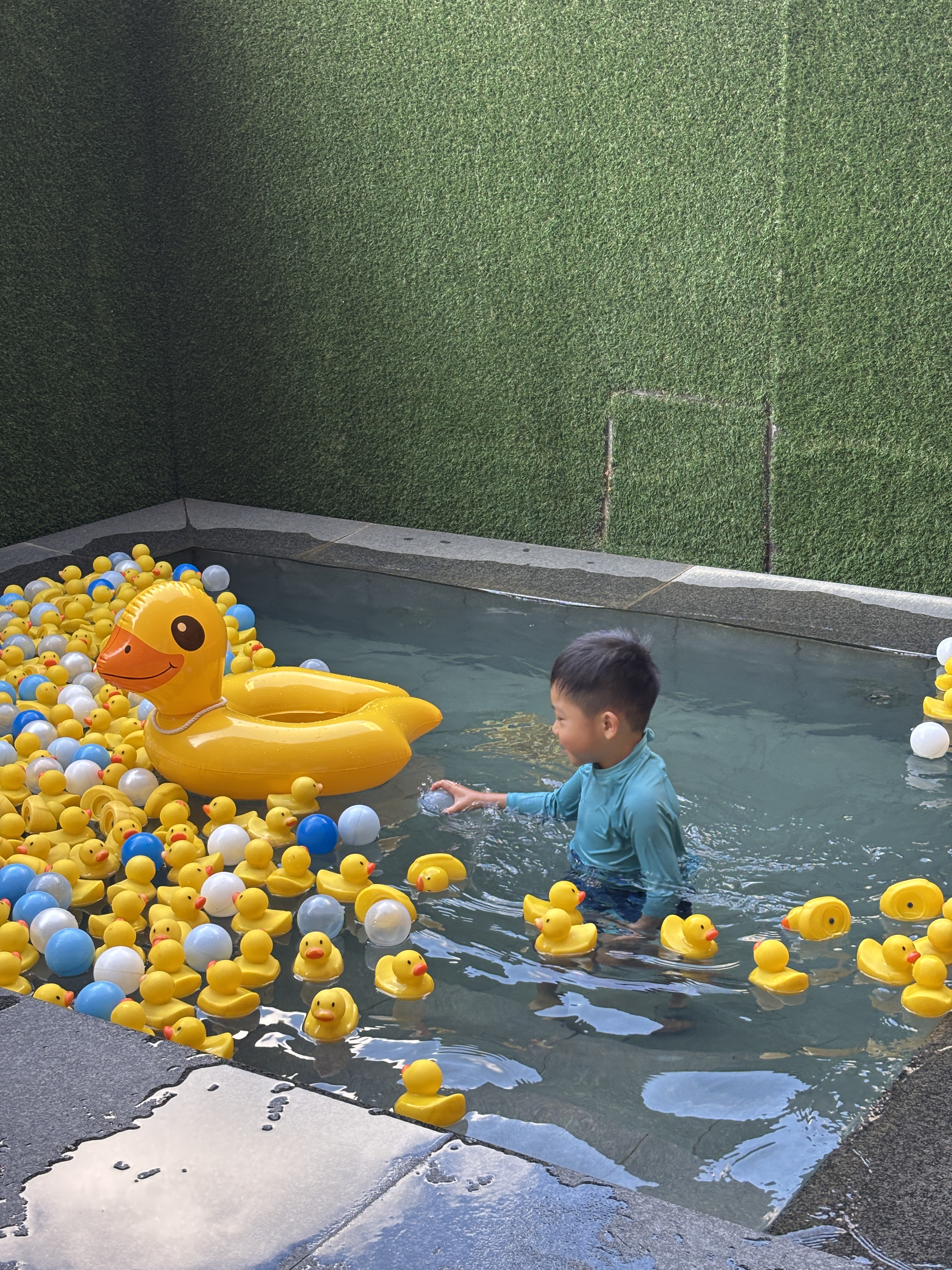 We had to observe our four-year-old carefully and reminded him to come out of the pool every 15 minutes or so. He actually turned as red as a lobster because of the higher temperatures! But otherwise, they really enjoyed the free floaties and throwing the yellow duckies all around!