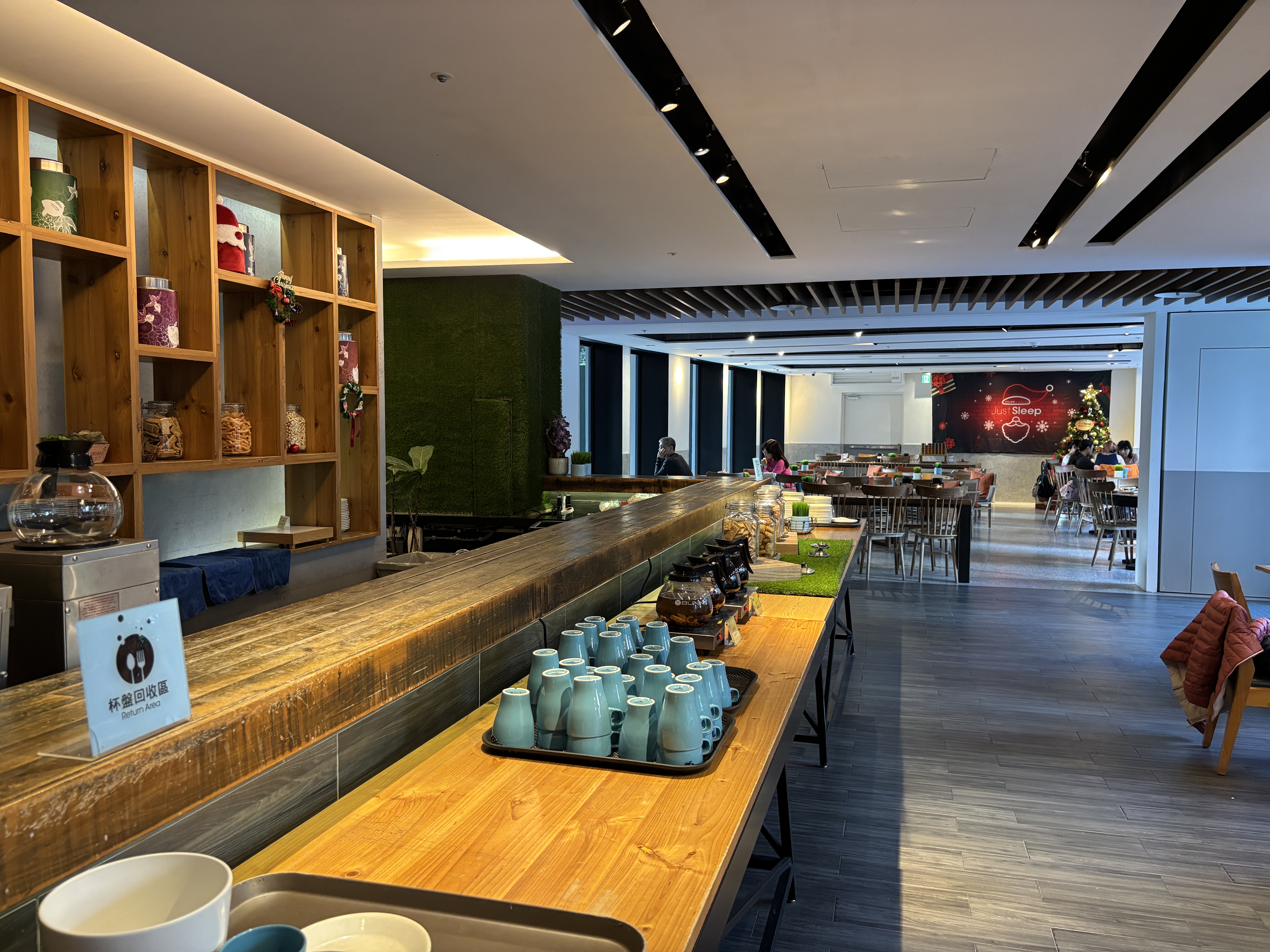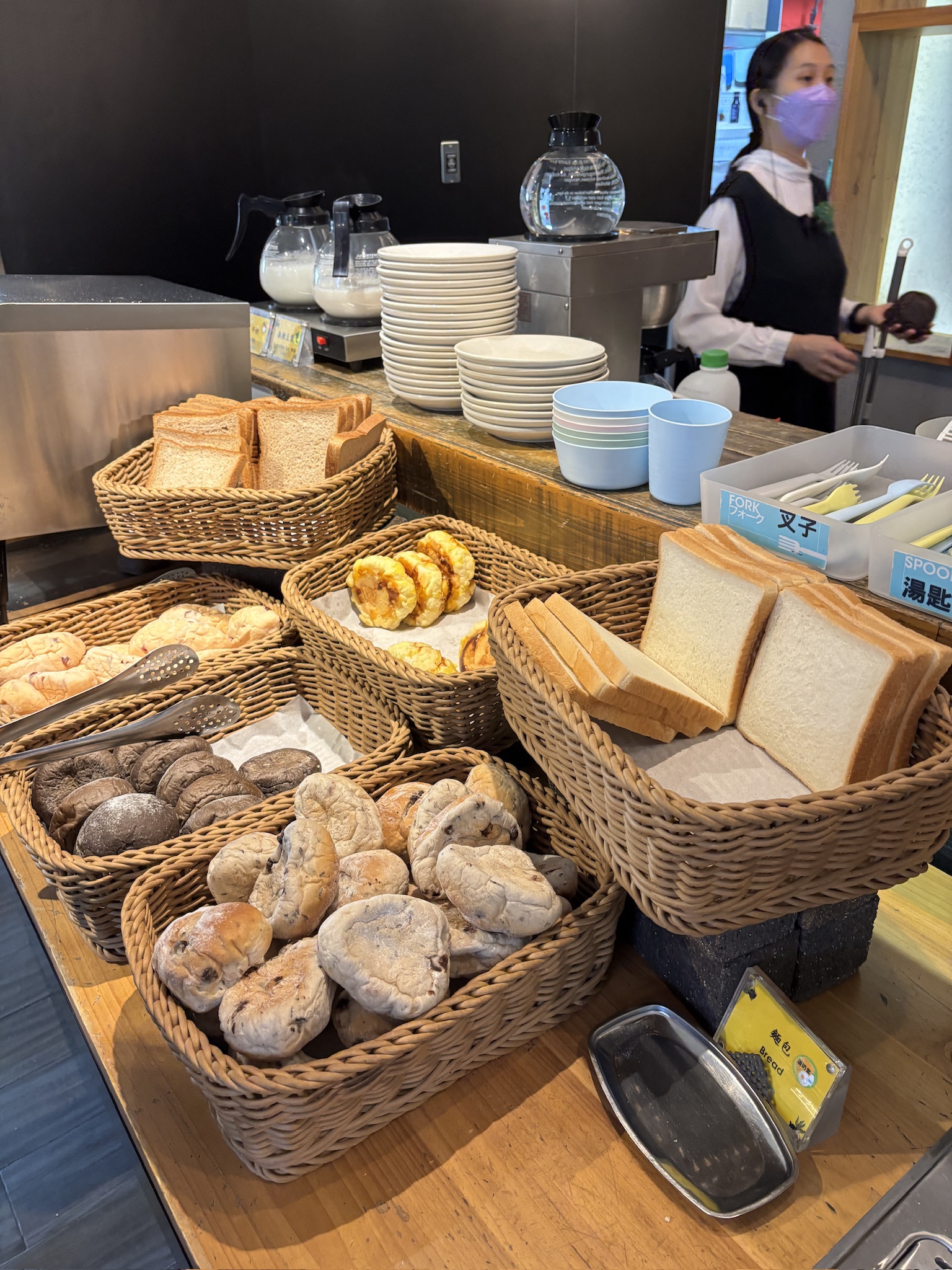 The next morning, we went downstairs to the cafe for the breakfast. Unfortunately, the cafe was full and we had to queue and wait for our turn. We also had to share seats with another family at the long communal table. This gave me some anxiety, as our kids can be a little fidgety — I worried about them dropping things, bumping into others, or generally being louder than ideal in a shared space.